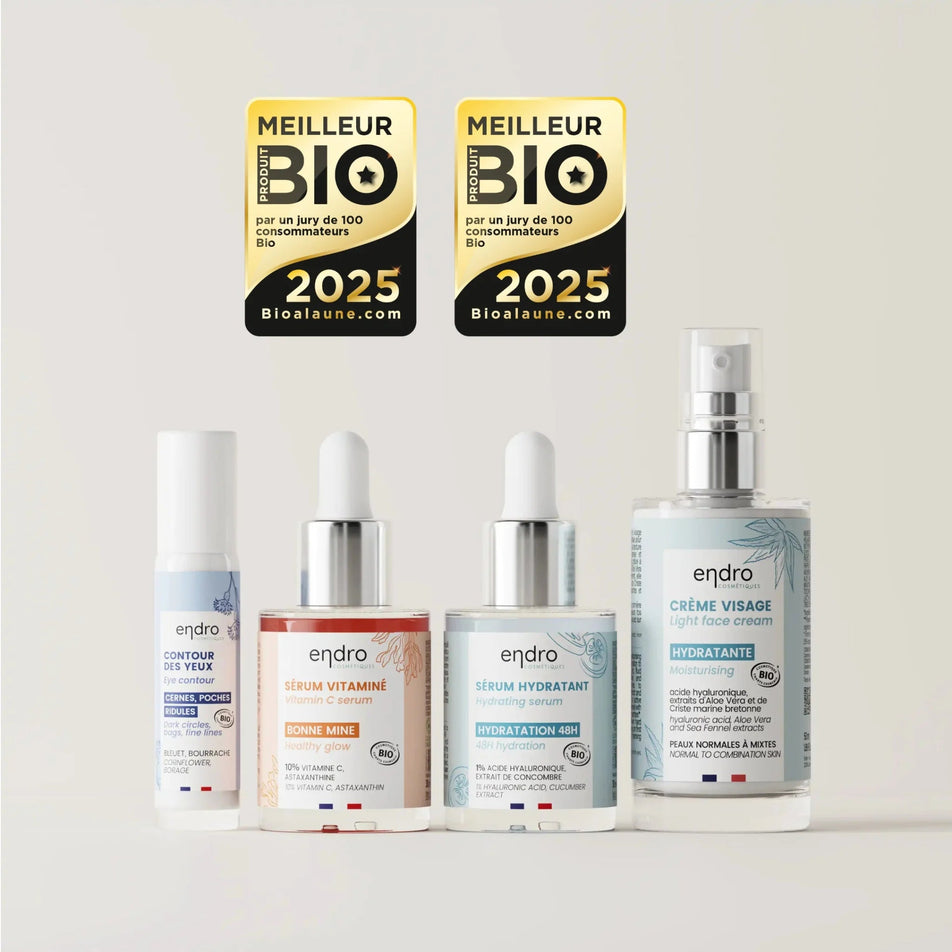 Application : Matin : contour des yeux, sérum hydratant, sérum vitaminé, crème visage