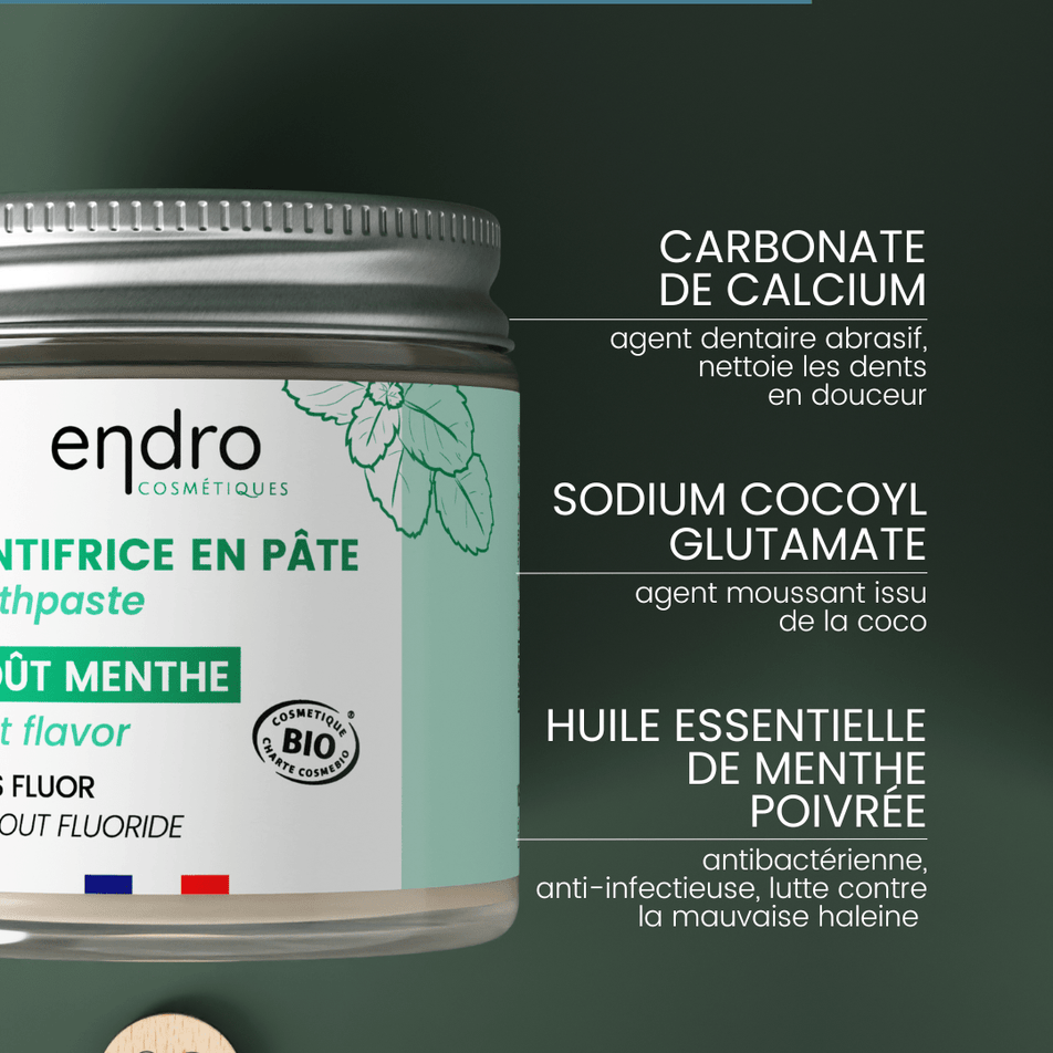 Ce sont les bactéries qui sont responsables de la plaque dentaire et donc des caries. Notre dentifrice naturel évite l’apparition des caries grâce à l’huile essentielle de menthe poivrée naturellement antibactérienne. De plus, nous avons fait le choix d'une formule basique, sans ingrédient controversé et ainsi sans fluor. Notre dentifrice en pâte certifié bio mousse légèrement et vous procure une agréable sensation d’haleine fraiche grâce aux cristaux de menthol. Quand on a testé ce dentifrice, on n'en veut plus d'autre. Une texture qui tient sur la brosse à dent et un goût de menthe naturel qui laisse en bouche une vraie sensation de propre et de fraicheur.
