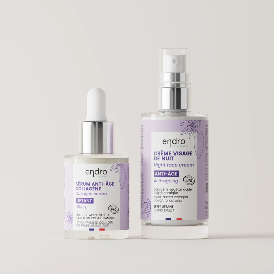 La routine idéale pour revitaliser votre peau durant la nuit. Notre crème à la texture riche, enrichie en collagène végétal et acide polyglutamique aide à restaurer l'élasticité et la fermeté de la peau. En complément, un actif à l’effet tenseur contribue à lisser les rides et ridules dès les premières applications ! Pour venir compléter ce duo, notre sérum au collagène ultra concentré va vous apporter une solution liftante efficace contre les signes de vieillissement. À chaque utilisation, la peau devient plus renforcée, plus ferme, plus douce et plus lisse au réveil.