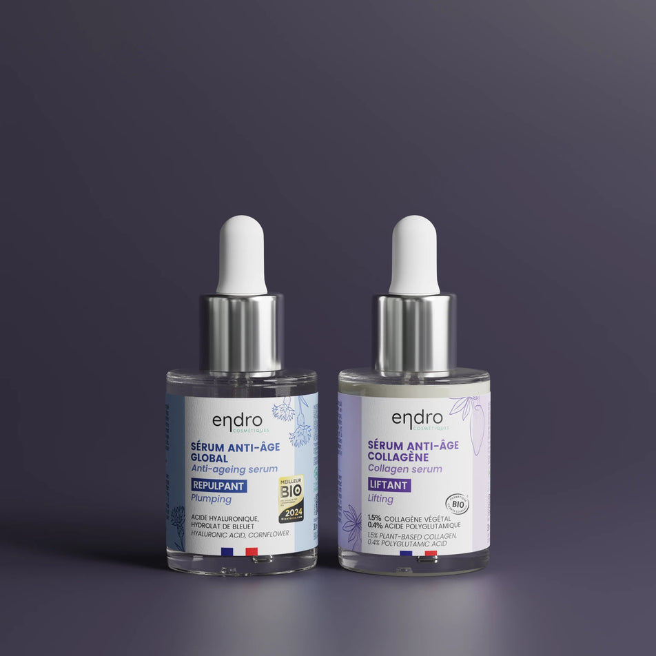 Découvrez nos sérums experts anti-âge et optez pour ce duo spécialement pensé pour les peaux matures ! Notre sérum anti-âge global va venir repulper et réduire l'apparence des rides et ridules. En complément, notre sérum anti-âge collagène va raffermir, lifter et améliorer l'élasticité de la peau, il apporte un effet tenseur immédiat.