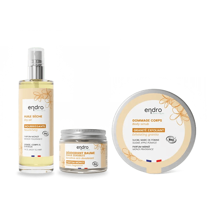 Découvrez notre routine corps au parfum Monoï, parfaite pour cet été. Si votre peau manque d'éclat et de douceur ou que vous souhaitez seulement avoir une peau nourrie et repulpée, cette routine sera votre meilleur allié. Notre gommage corps permet d’exfolier votre peau et d’éliminer les cellules mortes, tandis que notre huile sèche vient nourrir la peau et les cheveux, sans effet gras, tout en laissant un effet "glowy". Le déodorant, quant à lui, neutralise les mauvaises odeurs et régule le pH de votre peau tout en la respectant. Ces 3 produits sont essentiels dans votre routine beauté de l'été, n’oubliez pas de les ajouter à votre trousse de toilette pour les vacances !