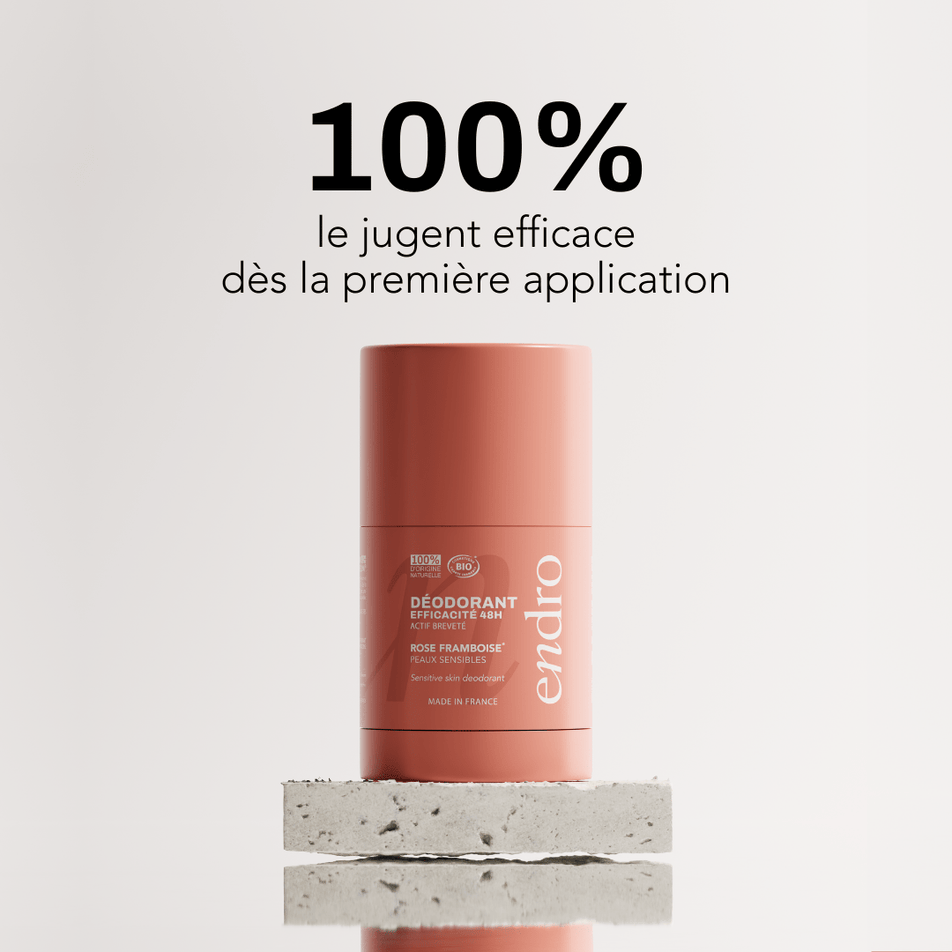 Jusqu’à 48 h, testée en conditions d’effort et de transpiration intense. L'efficacité 48h de nos déodorants sticks a été approuvée par un institut d'études indépendant et externe à Endro.