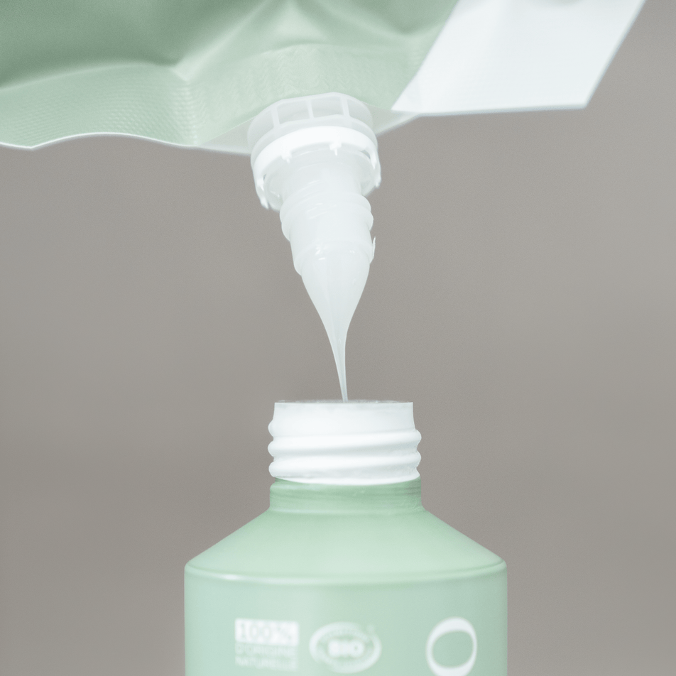Souple, recyclable et plus léger à transporter, ce format a été choisi parmi les options les plus durables disponibles aujourd’hui. Il permet de remplir deux fois votre flacon rechargeable et d’éviter l’usage de 5 tubes à usage unique.